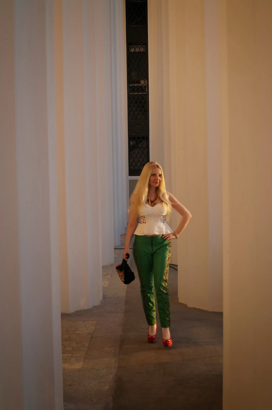 Photoshoot "Princess in green leather pants with top and bag embroidered with precious stones."